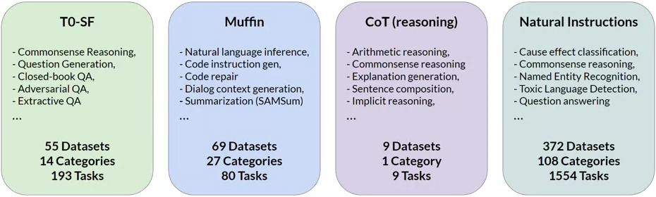 Fine tuned LAnguage Net (FLAN) is a specific set of instructions used to perform instruction fine tuning. When the T5 model is fine tuned with FLAN, it's called FLAN-T5. Similarly, there's FLAN-PALM. The image below shows how many datasets FLAN-T5 was trained with for multi-instruction.