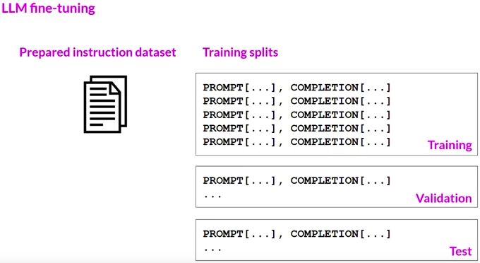 Fine-tuning, is supervised learning, where labeled task-specific examples (prompt-completion pairs) update the LLM's weights. It improves the model's ability to provide good completions for a specific task, often requiring just 500 to 1000 examples.